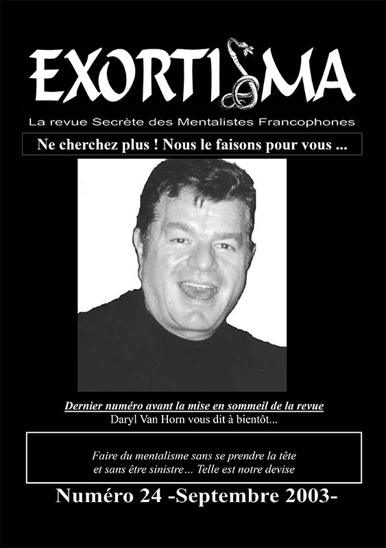 La revue que vous avez entre les mains est historique car c’est celle qui précède la mise en sommeil d’Exortisma. Que certains ne se réjouissent pas trop, cet arrêt n’est pas définitif mais j’ai trop de boulot pour ne me consacrer à un travail qui n’est pas rémunérateur. Si vous voulez en savoir plus rendez-vous à la dernière page. En ce qui concerne cette revue n° 24, elle est assez riche et je suis heureux de l’avoir réalisée, en partie, grâce à la contribution de lecteurs qui m’ont envoyé quelques effets sympathiques.